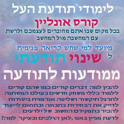 אשמח לענות על כל שאלה וללוות אתכם בתהליך השינוי שאתם חווים. מתעניינים להירשם לקורס ורוצים לשאול שאלות בעניין ,מוזמנים לי-צור קשר לשיחת ייעוץ אישי וירטואלית/טלפונית מקדימה ללא תשלום 052-4670045 בית שינוי תודעתי. תוכלו להצטרף לקבוצה קיימת או ליצור קבוצה חדשה – לבחור יום ושעה שנוחים לכם ,לתאם איתי ,לזמן עוד תלמידים להצטרף ללימוד ולהתחיל בתהליך