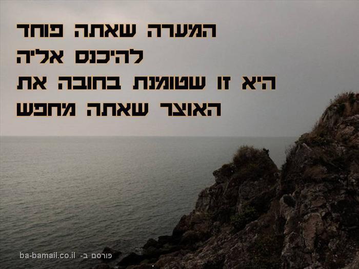 cave fearחוסר הבטחון, אי הוודאות והעדר היציבות במציאות החיצונית נועדו לטלטל להעיר ולהאיר עבורנו את האור הפנימי. כשאנחנו חשים איום חיצוני נוכח המצב הבטחוני/כלכלי/בריאותי/פוליטי/ (עם כל חיסון הפוליו/טילים כימיים במזה”ת/משבר כלכלי/יציאה מאזור הנוחות של חיי רווחה…), במקום לאפשר לפחדים לנהל אותנו (מים נמוכים) , מוטב שנתעלה לאוויר- להבנה הגבוהה.