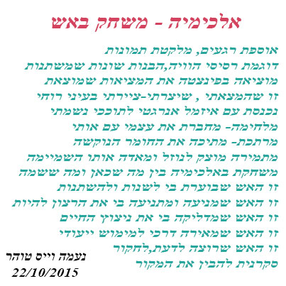 המים מקשרים יחד, מדביקים נגיד זכוכית לנייר כך שיהיו מחוברים , אבל הזכוכית תמיד תישאר זכוכית והנייר תמיד יישאר נייר . אנשים שהגיעו ממישורים שונים בבריאה, יכולים להתקבץ יחד ולשת”פ בהרמוניה, אבל כדי להתחבר באמת נדרש שינוי – חייבת האש לעשות את העבודה. כי בלי הרצון שלנו לדייק את היעד – לאן נגיע? לא נוכל לצאת לדרך אפילו לא מטר אם לא בחרנו מה אנחנו רוצים. לאש יש יכולת להתיך את הזכוכית הנוקשה לנוזל, לשרוף את הנייר ולהפוך אותו לפחם שיתמזג עם הזכוכית הנוזלית וכך נוצר חומר חדש. האש מגמישה את החומר=האדמה ואת מסגרות החשיבה הנוקשות שמנהלות אותו. (מה כשפות המים יכולה לעשות? להתמיר פחד לאומץ למשל: להפוך מצב רגשי נפשי נמוך לגבוה, כזה שיש בו הרבה אוויר=הבנה- כמו רחמים לחמלה)