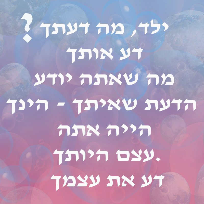 ילד, מה דעתך ? דע אותך. מה שאתה יודע – הדעת שאיתך – הינך , הייה אתה – עצם היותך. דע את עצמך.