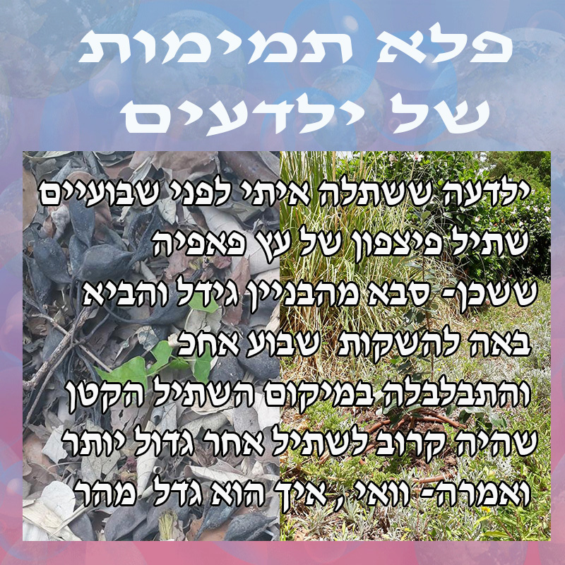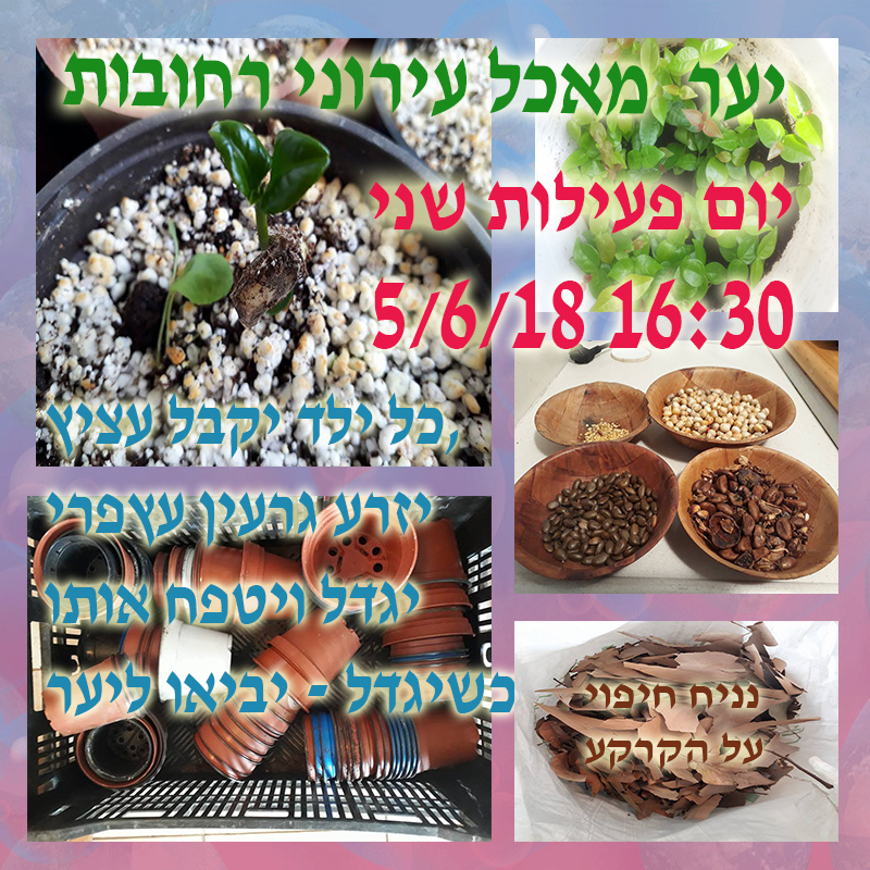 שתילות קודמות : פטל, מנדרינות, גויאבה תותית, גפן, תאנה, רימון, לימון, פיגויה, אבוקדו, פיטנגו, לואיזה , לימונית, פסיפלורה,- יולי 2018 יום שתילה שלישי -מפגש פעילות ומעגל שיח