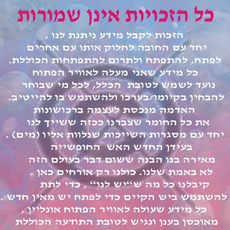 הזכות לקבל מידע ניתנת לנו , יחד עם החובה לחלוק אותו עם אחרים לפתח, להתפתח ולתרום להתפתחות הכוללת. כל מידע שאני מעלה לאוויר הפתוח נועד לשמש לטובת הכלל, לכל מי שבוחר להבחין בקיומו/בערכו ולהשתמש בו להייטיב. האדמה מנכסת לעצמה ברכושונות את כל החומר שצברנו ככזה ששייך לנו יחד עם מסגרות השייכות שנלוות אליו (מים) . בעידן החדש האש החופשייה מאירה בנו הבנה ששום דבר בעולם הזה לא באמת שלנו. כולנו רק אורחים כאן . קיבלנו כל מה ש”יש לנו” , כדי לתת , להשתמש ביש הקיים כדי לפתח יש מאין חדש . כל מידע שעולה לאוויר הפתוח אונליין , מאוכסן בענן ונגיש לטובת התודעה הכוללת
