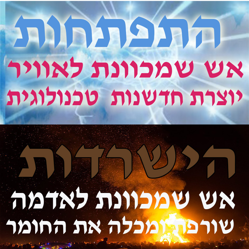 אש שמכוונת לאוויר יוצרת חדשנות טכנולוגית ומביאה להתעלות high-tech= למעלה . אש שמכוונת לאדמה שורפת ומכלה את החומר .